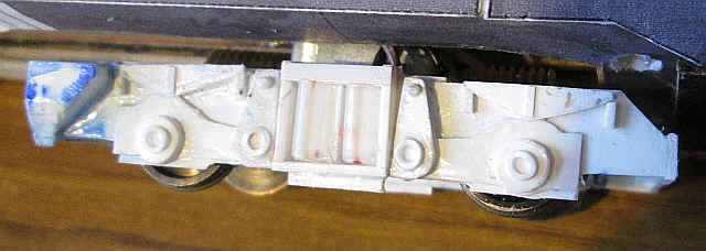 The power units for the models are BEC tramcar trucks (now produced by KW Trams) with a 42mm wheelbase which is virtually spot on for the V160. The trucks were supplied with O gauge axles and Ronford 14mm disc wheels which I then regauged to S Scale. A strip of scrap nickel silver was used as the chassis spine and the bogies were bolted in place as above.