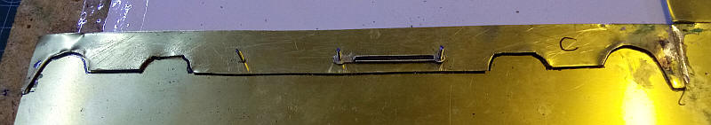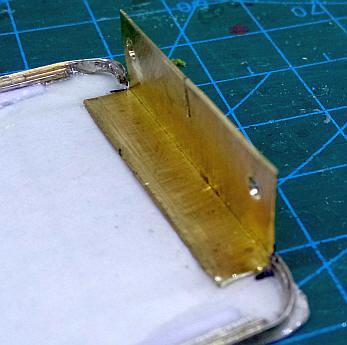 The construction of the cylinders starts by bending a strip of brass (15mm wide) into the profile shown in the diagram, Bends are made by scoring the inside of the brass with a heavy duty craft knife before folding - this is much the same as bends in an etched kit. The brass is the soldered to the main frame and all edges are tinned with solder ready for the front and back faces of the cylinders to be fixed in place.