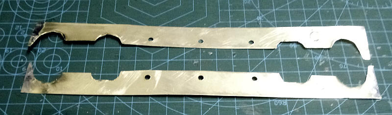The frames were printed out and glued onto a sheet of 0.16" brass sheet cut carefully to the shape of the paper template with sharp scissors. Using a steel ruler to make sure the axles holes will be in a straight line, I used a sharp compass point to mark the centre point of each hole and then drilled through the brass to make a pilot hole.