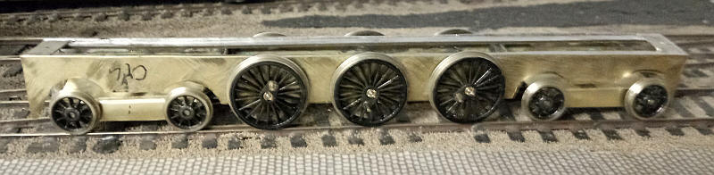 The frames have been assembled with my usual method of strengthening the thin brass by soldering double sided copperclad sleeper strip along the top edges. A small number of frame spacers have been added and the bogies have been assembled as below.