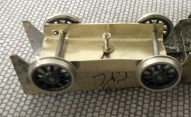 The bogies are made from one piece of sheet brass with axle holes drilled. The brass was heavily scored where the fold is to be made and bent to shape in a small vice. The pivot point is a slot about 5mm long through which a bolt is screwed into a nut soldered over one of the frame spacers. Thus the bogie frame can move from side to side as well as the axles having several millimetres of side play. This allows the chassis to roll smoothly around the 36" radius curves on the layout.