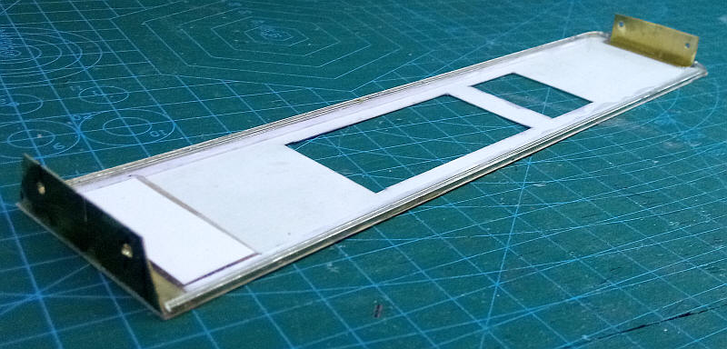 The footplate will be a combination of card and metal. The first step is to cut a piece of card with holes to clear the top of the wheels. This has been coated with wood rot fluid to harden it.