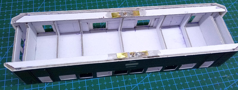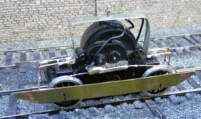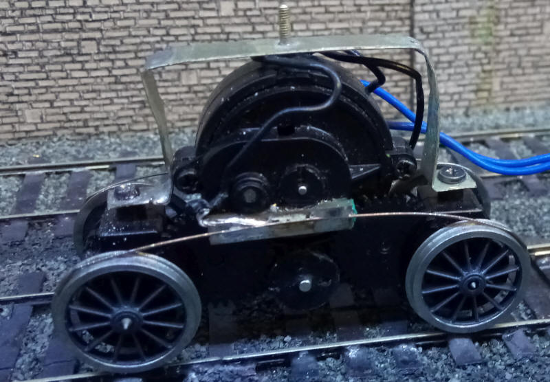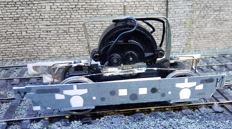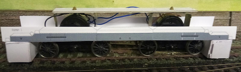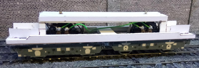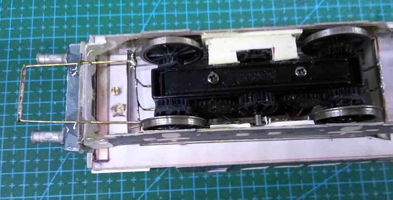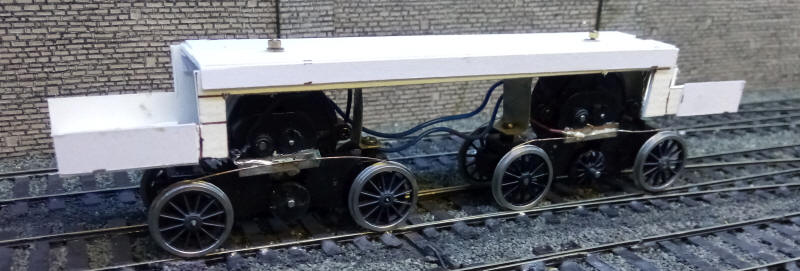 The bogie bolts are passed through holes in top of the frame which have washers superglued to both top and lower surfaces of the card. The motor bogies are connected electrically so there is 8 wheel pick up and running is extremely smooth.