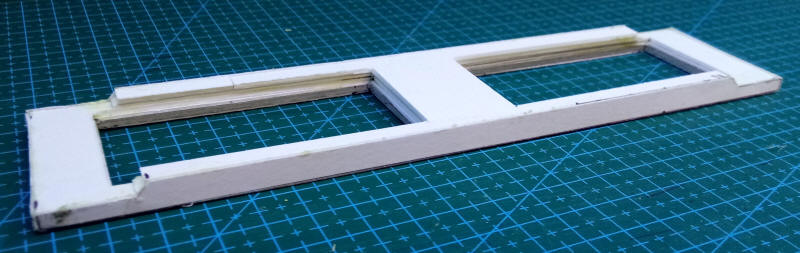The cab ends have ahd slots cut in them to clear the chassis frame. The ends and sides were glued together and a piece of mounting card was cut to the exact size needed to hold the sides correctly and glued in place.