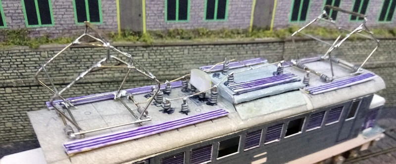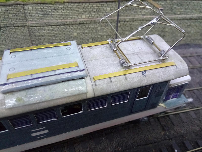 The model has progresses a little more with the two pantographs completed - soldered from nickel silver wire with card siscs for insulators. The pantographs are rigid and built to the same height as the BR E69 so that if I ever build a layout with overhead wires they can be set at a height just above the pantograph contsct strip.