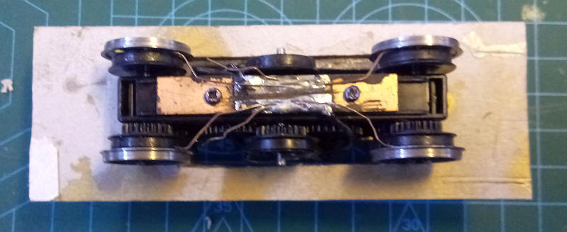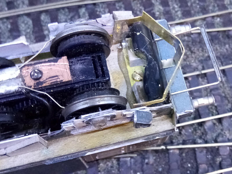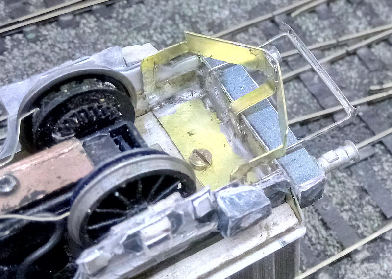 As can be seen the plough is bent at the centre and is secured to the rear of the bufferbean with a piece of brass strip. The side legs of the plough are soldered to the inside of the underframe.