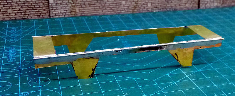 Using 0.01" (0.25mm) brass sheet I cut out a net of the two side frames and two stretchers. The brass was cut with a scalpel blade using repeated scoring until the unwanted sections of metal could be removed. The result shape was bent to produce what looks like a wagon chassi structure. The brass is obviously very flimsy but lengths of 1,00mm diameter brass wire were solderd along the top edges of the sides and the insides of the stretchers were flood with solder. The card outer frames can now be glued ot the metal.