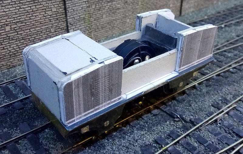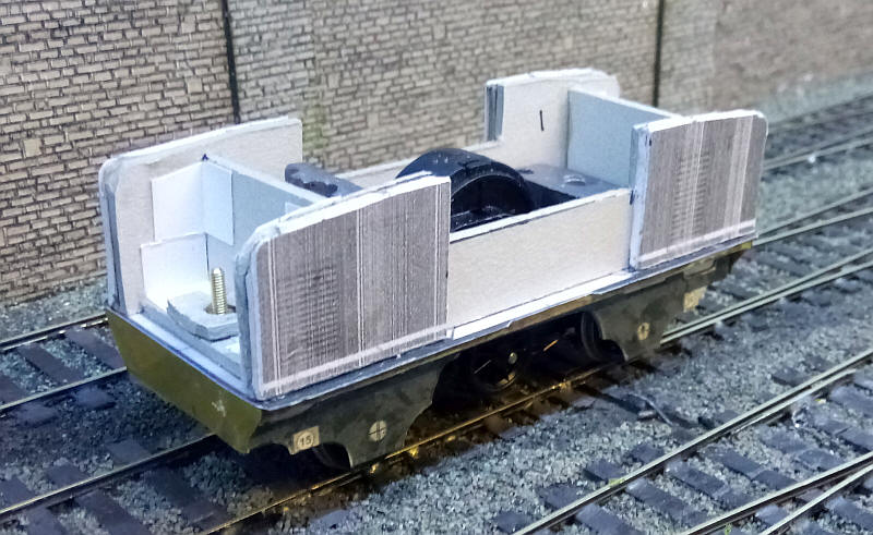 The loco's bonnet ends have been glued to some back pieces of mount board and placed loosely in place on the footplate. These form the sides of the loco with space for the cab in the middle,