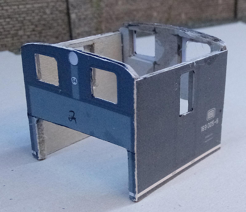 The two parts of the cab were cut out with a section of the cab front cut away at the bottom to clear the motor area. The cab sides were then assembled and strengthened with a inner layer of mounting board.