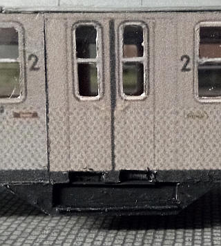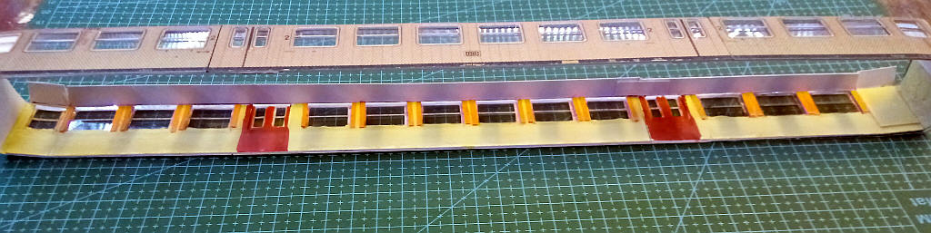 One section was made from photographs of the short compartment at the ends of the coach with the ends spliced in between the end section as below: