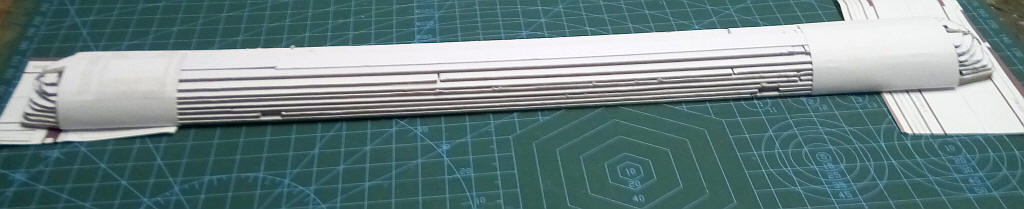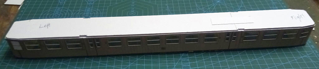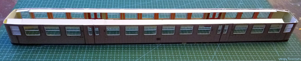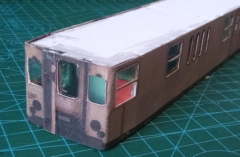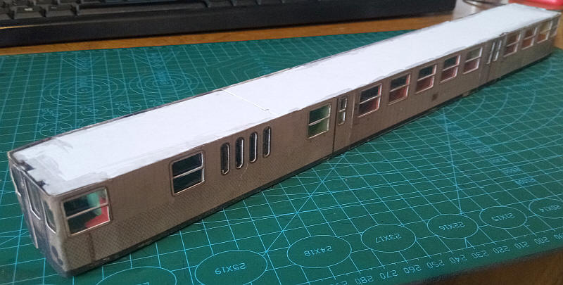 The body has now been sealed permanently with a ceiling made thick card glued in place on top of the longitudinal tab above the windows. A thin layer of epoxy was also spread along the joint between the ceiling and the top of the body sides. This will ensure that the card above the windows stays completely straight.