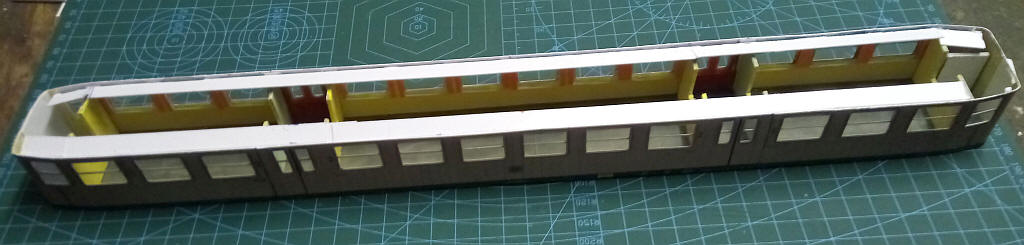 The basic body shell is now complete with the interior built in the same way as the full 2nd class vehicle. The false ceiling has been glued to the tabs along both sides and the gap between the body sides and the ceiling have been filled with epoxy to give rigidity to the sides