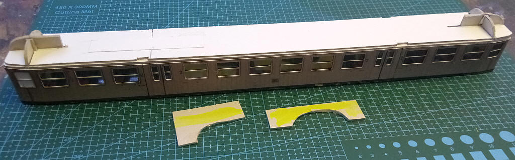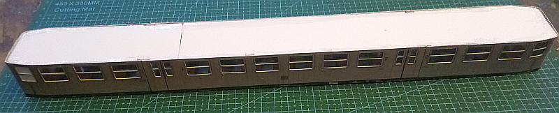 The roof profile has been built up using strips of mounting card. At the ends the domed shape will be built up using epoxy resin filed to shape. In the photo I've masked off the end from the rest of the roof ready to begin this process.