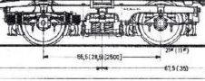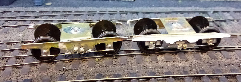 The bogie side frames and centre stretcher bar are made from a single piece cut from brass sheet and then folded into a U shape. The springs in the centre are short sections cut from a brass bolt and soldered onto the side frames. Brass wire is soldered across the ends of the side frames and a length of wire soldered along the top of the side frame on the front to represent the strengthening bar on the original bogie. A thin piece of card cut to the shape of the side frames as in the small diagram above and glued to the brass. This includes a square shape either side of the axle boxes which is presumably a type of compression spring.
