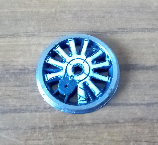 The card was then glued on to the correct size wheel with epoxy. A thin smearing of epoxy was later added to the top of the card and also underneath the card between some of the plastic spokes.