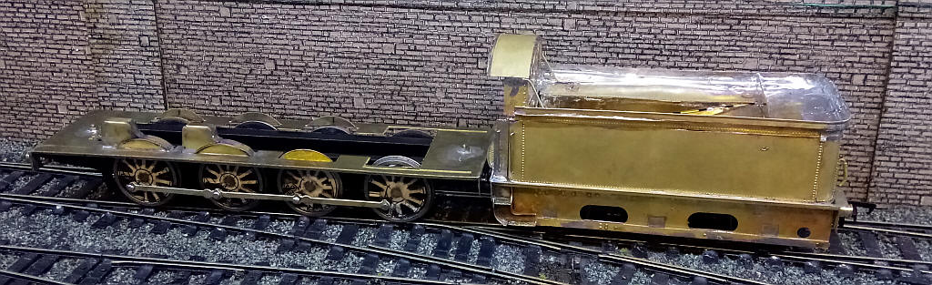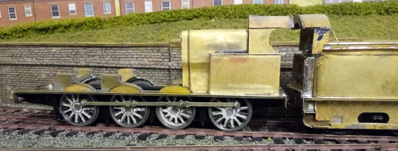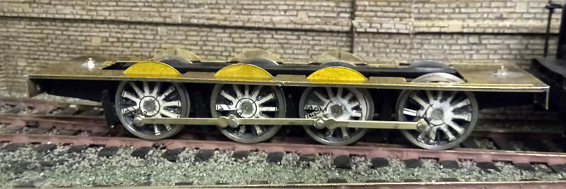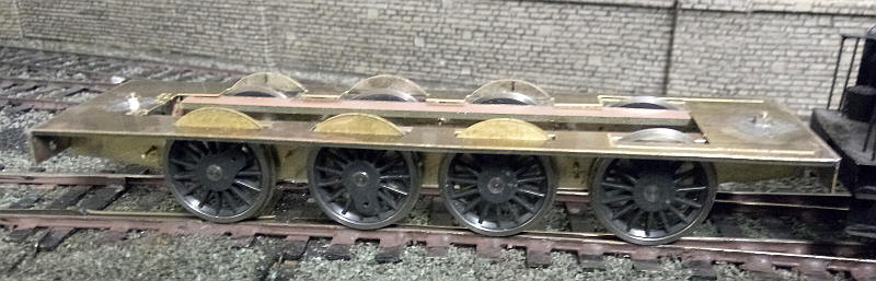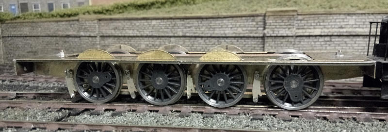 The front of the wheel splashers have been bent up and Alan Gibson wheels have been temporarily fitted to the chassis. When being propelled by a powered tender this revealed (as expected) some spectacular arcing as the backs of wheels touched the back of the splashers. Otherwise the chassis rolls well.