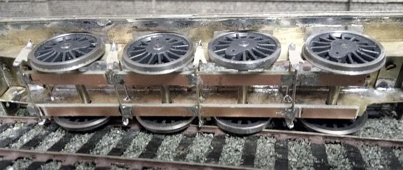 The lengths of copper clad sleeper soldered to the brake hangar cross wires will be used to provide current pickup form the outer axles. The copper is gapped to give isolated sections of copper behind the wheels.