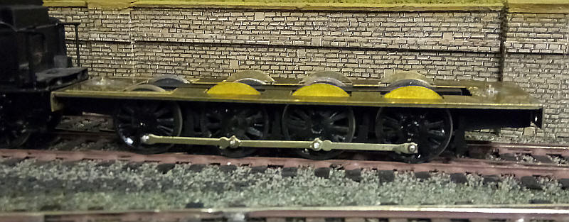 Viewed from underneath, the flangeless third wheel is more obvious. Careful filing can produce a wheel that doesn't have its tread damaged. To avoid the flangeless wheel cause problems catching on check rails or simply falling off the rail on curves I found it necessary to limit the side-play on both the third and fourth axle to a minimum.