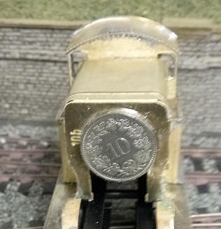 The boiler is secured in place at the smokebox end by sliding it inside the smokebox wrapper but the method I've chosen to secure it at the firebox end is unusual. A Swiss coin - a 10 cent one - is glued to the front of the firebox with epoxy. The coin is a perfect fit inside the plastic inner tube of the boiler.