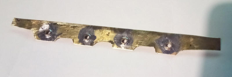 I've now cut out the main frames. The cut outs at the ends of the frames were made using scissors. The three cutouts between the axle holes were made by first scoring the brass along the straight lines with a heavy duty Stanley knife and then snipping the short diagonal lines with scissors. The small sections of brass were then broken loose using a pair of pliers to bend the metal until it broke. The corners were slightly rounded with a file. It's a crude but reasonably effective method. The axle holes will now be opened out with broaches and bearings fitted.