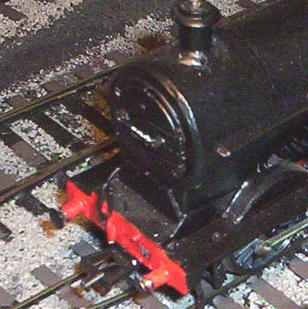 I still wanted to be able to uncouple the vehicles easily and here is the "clever" part. I simply super-glued a 5mm length of steel paper clip wire to the outer face of the coupling hook, later painting it black. Uncoupling is carried out using a small magnet attached to a length of plastic which raises the coupling hook whenever needed.