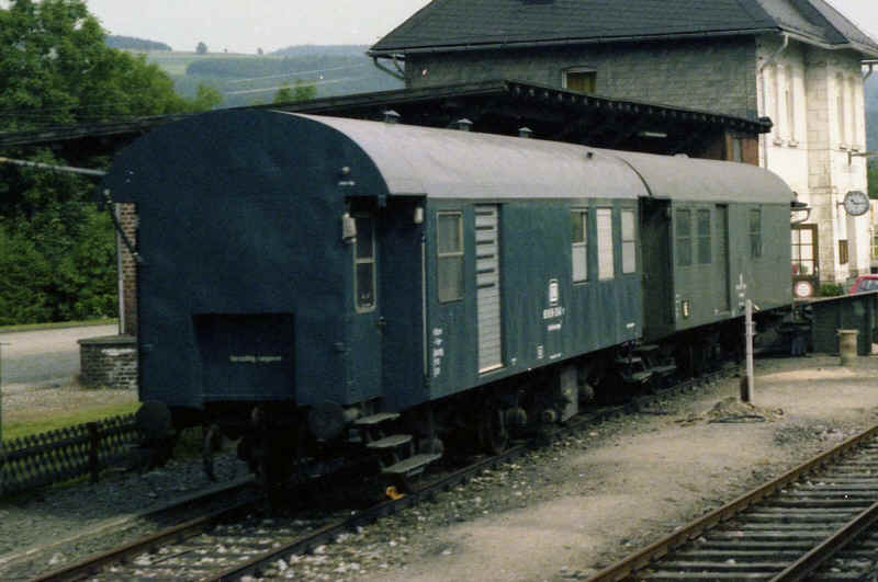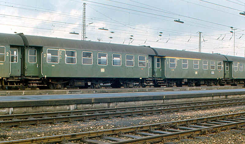 Photo of two Deutsche Bundesbahn three axle 'Umbauwagen' seen in August 1980 after withdrawal from passenger service and now in use by the engineering department. I believe the one nearest the camera was originally an all second class coach whilst the green one was a 2nd class with conductor's accommodation as.