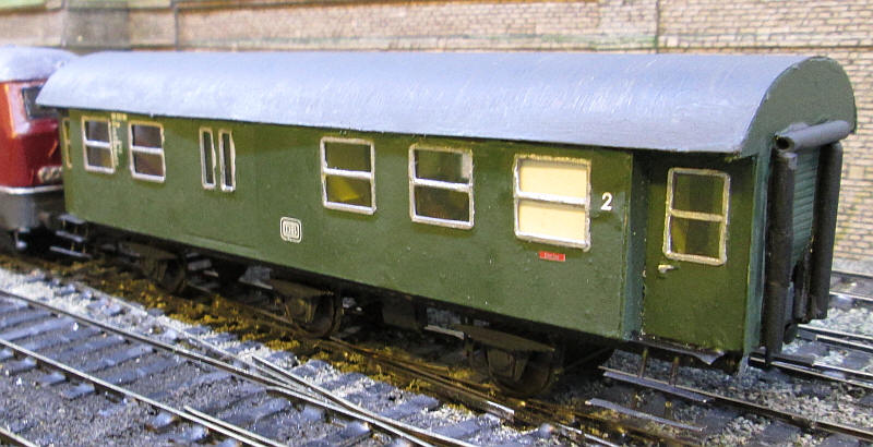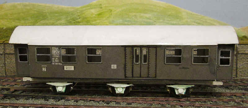 Here the roof is painted and the waterslide S Scale transfers have been added. These were made specially for me by Andreas Nothaft at http://www.modellbahndecals.de. I've only used a fraction of the lettering on the sheet. All that is left to do now is varnish the sides with matt varnish and add one or two small details such as the tail lights and the ventilation ducts at the passenger compartment ends.