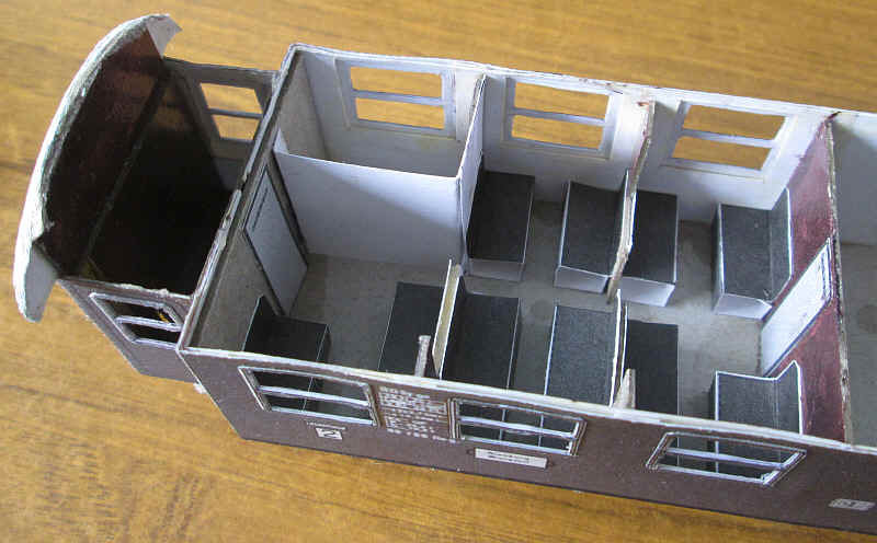 To complete this stage of construction I added various pieces of thick card to both keep the body sides rigid and support the roof. You may notice that in the passenger compartment at the far end there are vertical strips in between the windows. These are actually present in the real vehicle and were intended to reduce draughts when the windows were opened.
