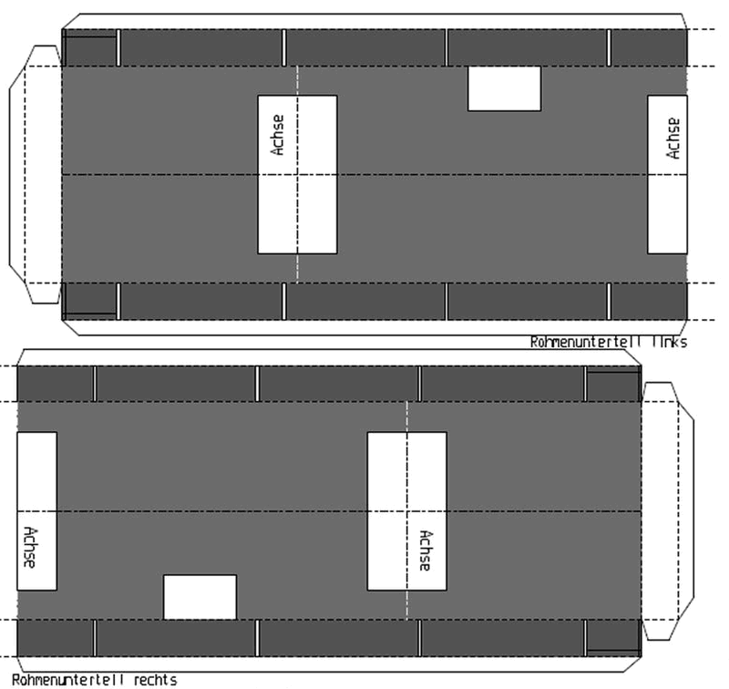 The underframe was going to be built out of card using some adapted parts from the Pirling pdfs. These are described as Rahmemunterteil (frame under parts) . The kit produces them in two sections which are glued on to the upper frame parts. I wouldn't be using these. Below are the two sections from the pdfs.
