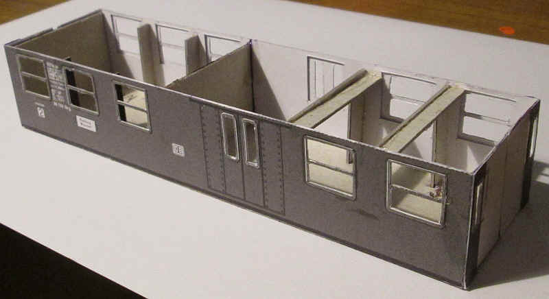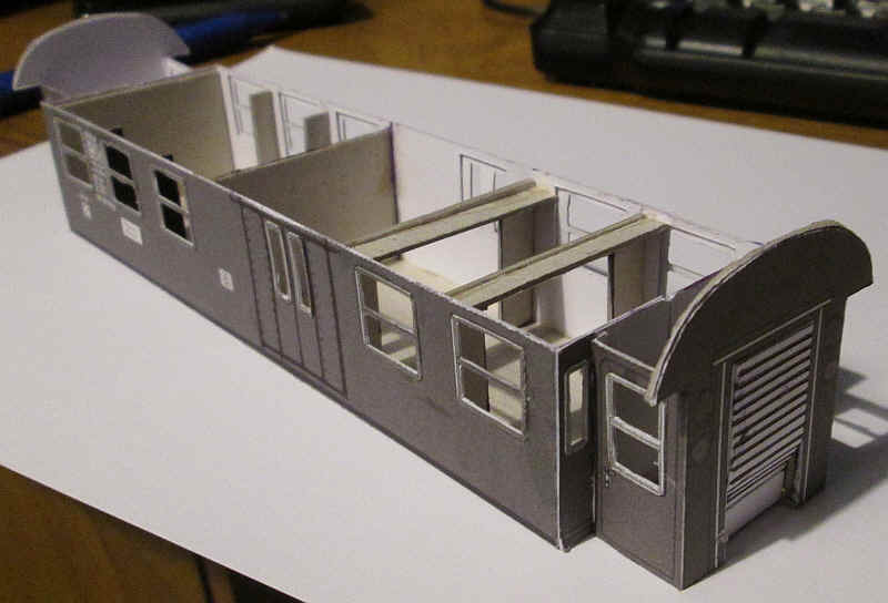 I then used the inner ends that had had their window units cut out to form the inner strengthening layer. I also enlarged the window openings to allow the glazing to be glued in place after painting. The small tabs along the curved roof and the top of the doors were cut off, but those by the side of the doors were left in place.