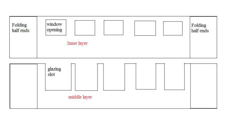 Having assembled the two sides the next stage was to add two inner layers of the sides. The middle layer has slots for the glazing strips to be dropped in palace from the top and was glued to the back of the outer side. The inner layer which has openings slightly larger than the sides was glued in place on top of the middle layer (see diagram below)