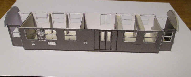 The next stage in building the coach body was to add the two ends with the passenger doors. These are considerably narrower than the main body as this enables the steps down to platform level (remember German stations often had platforms almost at rail height) to be contained within the loading gauge. The kit contains both outer and inner layers to these ends which are designed to fit inside each other.