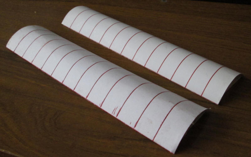 Success on the fourth attempt! The roof was cut from the template on the pdf and slightly narrowed by about 2mm and then curved around a broom handle. One edge of the roof was glued to the side tab on one side of the model. After this had thoroughly set the underside of the card was coated with a layer of expoy and some was also run along the other side tab. Then the roof was pressed down and held in place with elastic bands until the epoxy started to set and then the edge of the roof was pressed firmly onto the tab until this hardened completely. A sliver of card then had to be cut from the edge to give a close fit to the side.