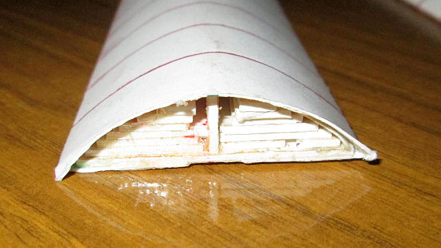 After checking again for fit the interior of the roof is filled with strips of mounting card glued in place. Start with a vertical piece along the centre line and then fill with strips of reducing width. These should be placed so that they are in contact with the inside of the roof and will form a very solid structure.