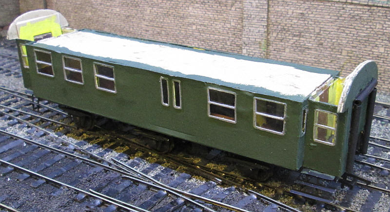 With the axleboxes and springs secured in place (and one of the attempts at the roof perched on top of the body) I've placed the carriage body in the correct place on the chassis. The gaps at the end of the body are correct as the Umbauwagen were close coupled and the buffers were actually underneath the carriage ends.
