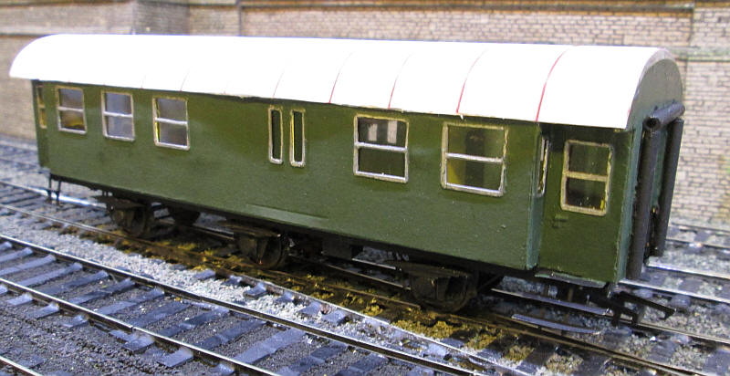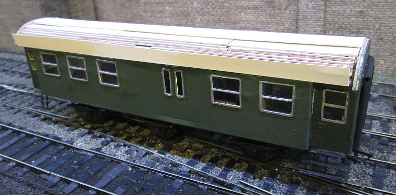All vehicles have a strange ventilating system on the roofs which feed air into the upper part of the interior through flaps which can be opened or closed by the railway satff as needed. These were built out of laminated card cut at various angles to replicate the original. The photo below shows these as modelled on Lenz O Gauge models.