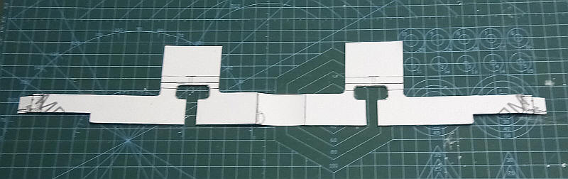 I found a good scale drawing of the Fowler 2-6-4T on the internet showing all the necessary elevations. Having printed the cab, side tanks and bunker onto thin card I joined them together with a piece for the rear bunker and then backed the majority of the thin card with a layer of mounting card. The cab roof extensions, the rear of the bunker and fronts of the side tanks were left as a single layer of card. The resulting net is shown below. It is very flimsy at the moment but will become rigid as construction progresses.