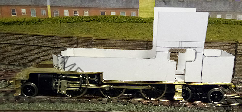 The tank sides, cab and bumker have now been secured to the brass footplate using strips of mounting board glued to the footplate as location points.