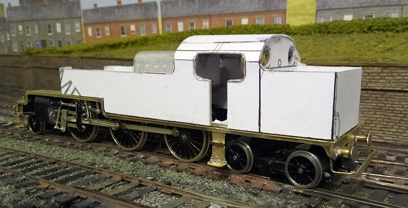 The smokebox wrapper has been glued to the ring of card with epoxy and also soldered at the front to the smokebox door ring and it is now sititng on the smokebox saddle at teh correct height. I've temporarily placed the cab roof and chimney and the loco is beginning to look like a Stanier 2-6-4T.