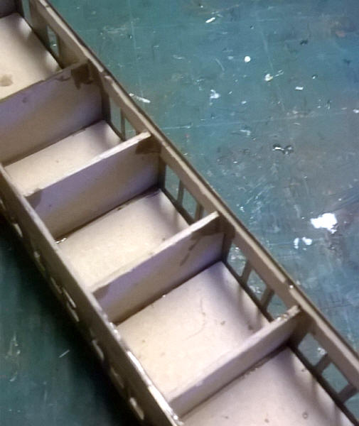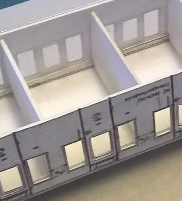 The compartment walls have been added and are fixed to the false ceiling and also to the card strengthening strips on the body sides. A rectangle of card has been glued to the ceiling of each compartment with a small gap behind the windows. This will be used to trap the glazing. The seats will be added after the model is painted and the glazing in place.