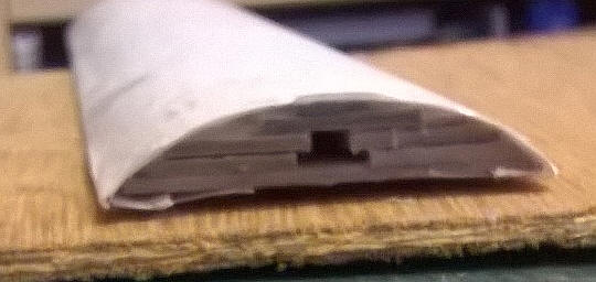 The paper is then coated with a thin layer of epoxy resin adhesive and a second layer attached and left until the epoxy has hardened. The paper will require gentle pressure to ensure it is fully attached to the first layer of paper. It's also important to make certain that there is a sharp fold at the edge of the roof. Once dry the brass roof can be carefully slid out from under the paper.