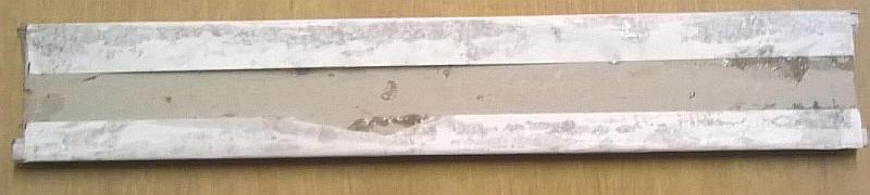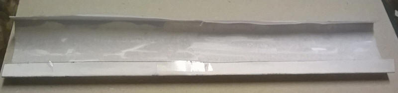 The epoxy resin will ensure that the paper retains its correct shape. A 265mm length of thick (1mm) card was cut to the correct width of 42mm for the base of the roof. This is slightly shorter than the actual roof itself to allow for the ends of the carriage body. The paper roof can then be stuck to the card using the flaps