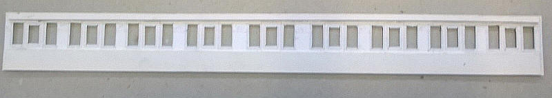 Two long strips of mounting board ( one 3mm wide and the other 10mm wide) were cut to length and glued above and below the windows respectively. This give the sides rigidity and will also give space for the glazing strips.