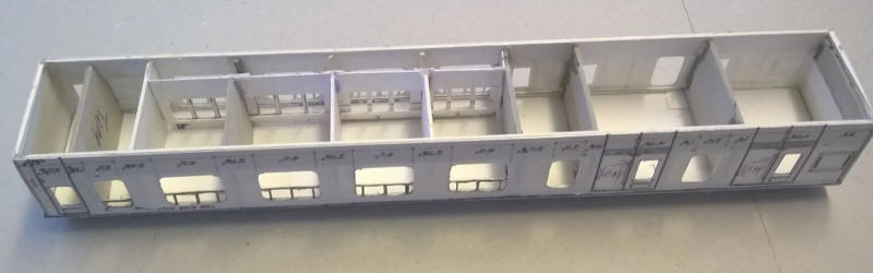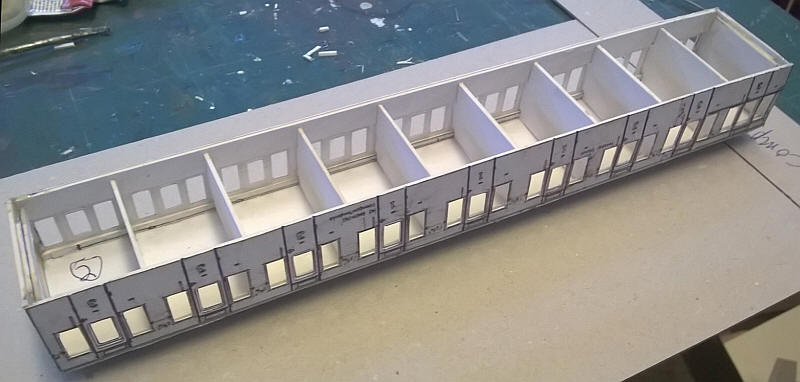 The main body is now complete with the various compartment walls in place. I've also added the doors and windows between the corridor and the compartments.
