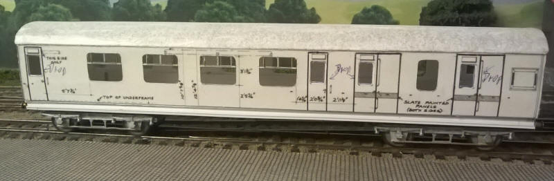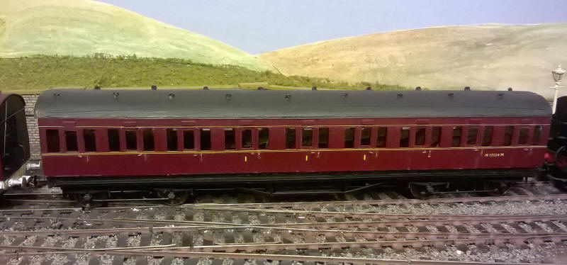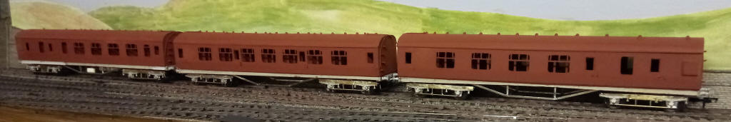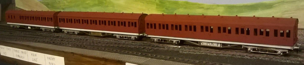 The rake of three corridor coaches. From left to right they are a Brake 3rd, Corridor 3rd and a Brake 1st. All are 57 feet long versions. Ideally I would have preferred a corridor composite rather than a Brake 1st but the composites were 60 feet long and building one of these would make the train too long. Fortunately some of the small number of Brake 1st lasted in service well into the 1960s.