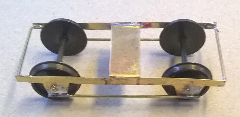 The first bogie has been soldered together. 1mm brass wire has been soldered across the space between the bearing holes. A 10mm wide strip of brass has been folded at each end to give tabs which are then soldered to the bogie side frames. The wheels have been inserted and 1mm brass wire soldered across the ends of the frame.