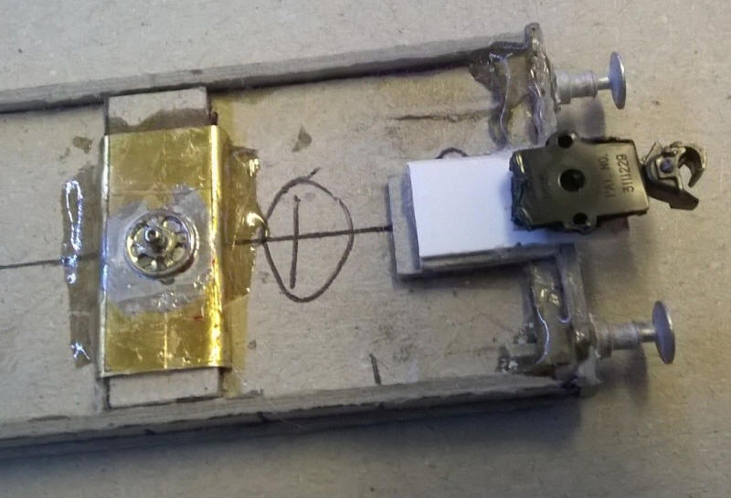 The scratch built bogies are pivoted on a male press stud. This is soldered to a piece of brass which is then glued onto strips of mounting board to give the correct height . 4mm scale LMS coach buffers from Lanarkshire Models & Supplies have been added to the bufferbeams and a Kadee coupling attached at one end.