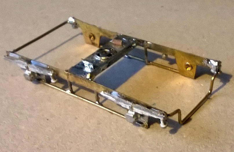 The stretcher bar has now had a hole drilled in it to accept the female part of the press stud which will form the pivot for the bogie. Small lengths of 1mm diameter wire have been soldered in place to represent the secondary suspension of the bogie.