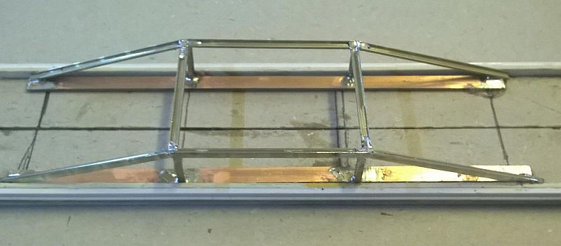 A 126mm long length of Peco Code 75 rail was bent at the 42m and 84mm lengths using a simple jig. These were then soldered in place. The short vertical lengths and cross pieces were also cut from rail. The flat bottomed side of the rail was placed on the outside to replicate the appearance of the steel sections used.