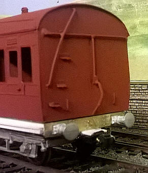 The ends of the carriages have quite a bit of detail to be added to them. Still to be added are the coach lighting wires which I appear to have forgotten on this carriage! The bodies have now all been painted in red oxide primer.
